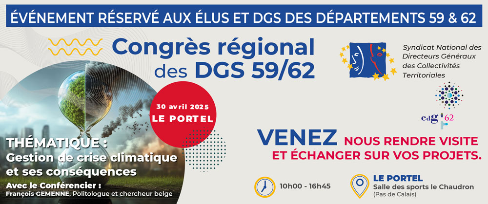 Le CdG62 sera présent en tant que partenaire-exposant au congrès régional des DGS Nord Pas-de-Calais le 30 avril 2025 à la salle des sports "Le chaudron" LE PORTEL (Rue Charles Lamarre).